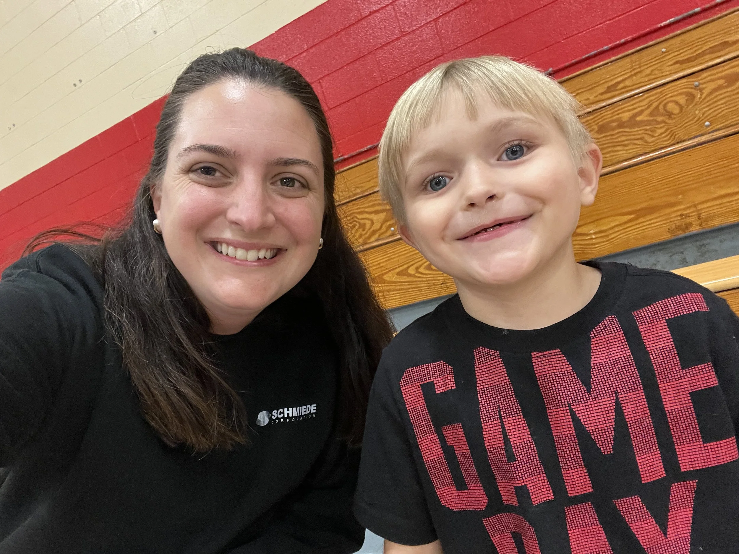 Program manager Mrs. Kylee (left) smiles next to Liberty Elementary student Jackson (right).